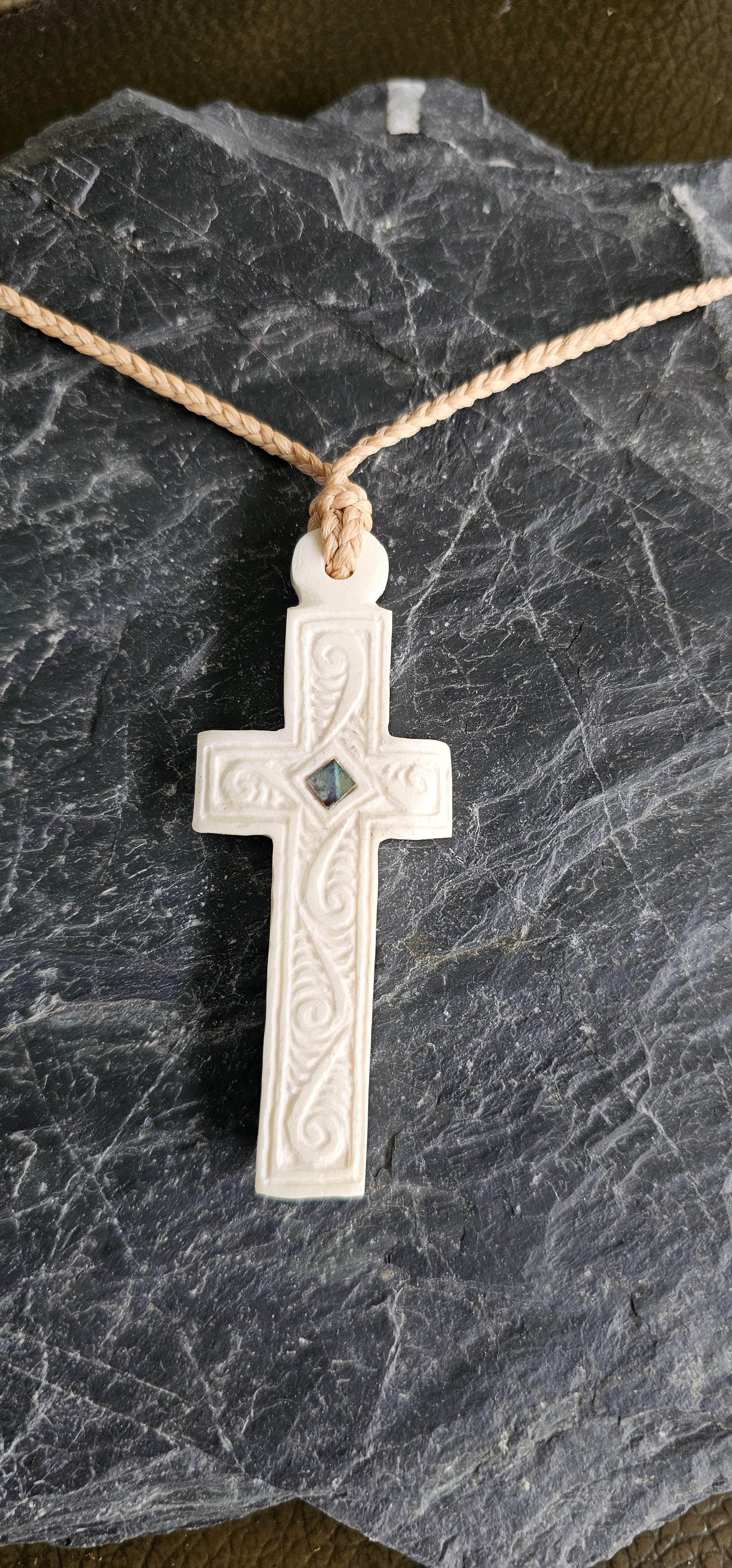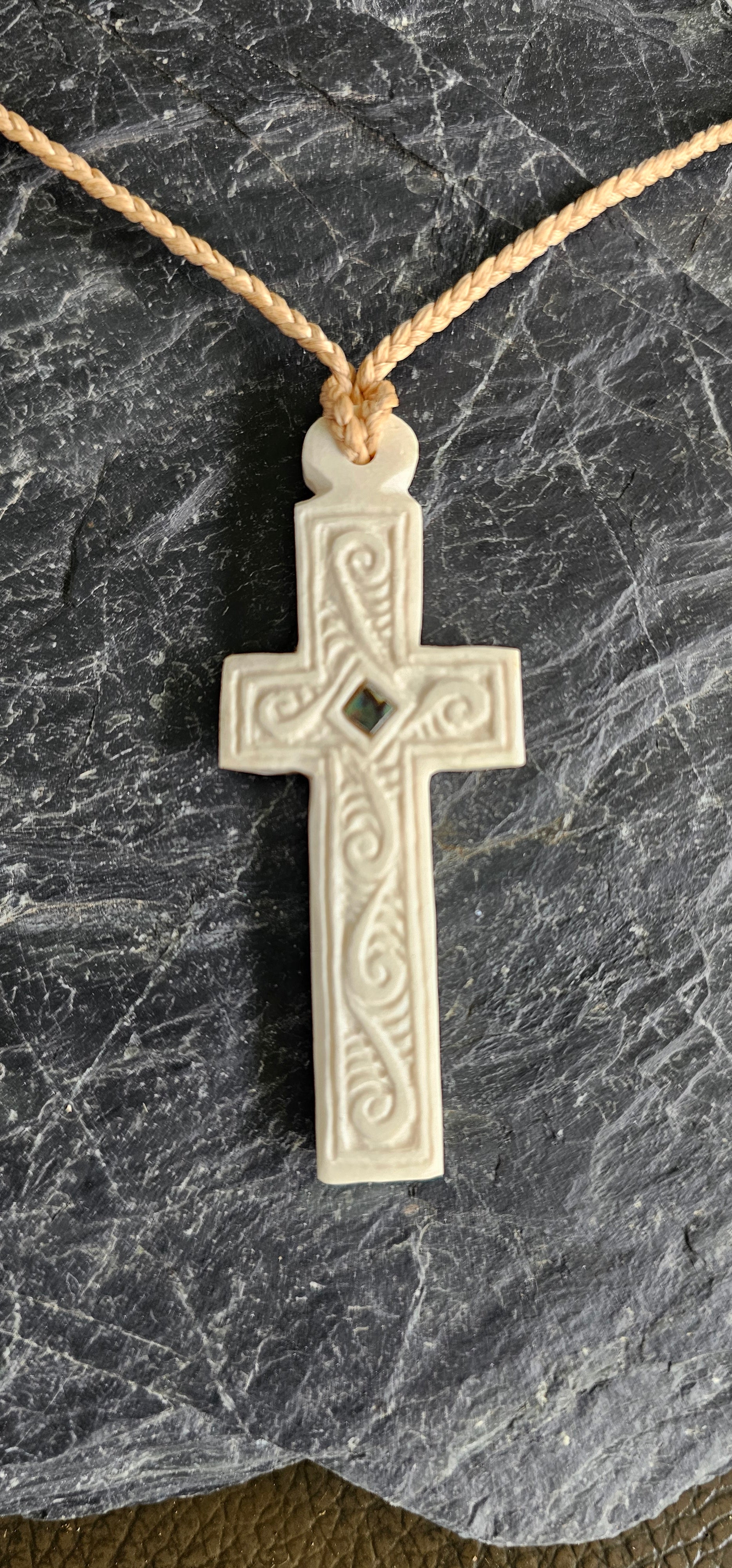 A ripeka (cross) symbolising the story of faith as depicted in the story of the cross. This cross has the pākura design and a paua inlay in the centre, on both sides. A beautiful taonga to wear to encourage yourself or someone special to keep faith and hope in God.