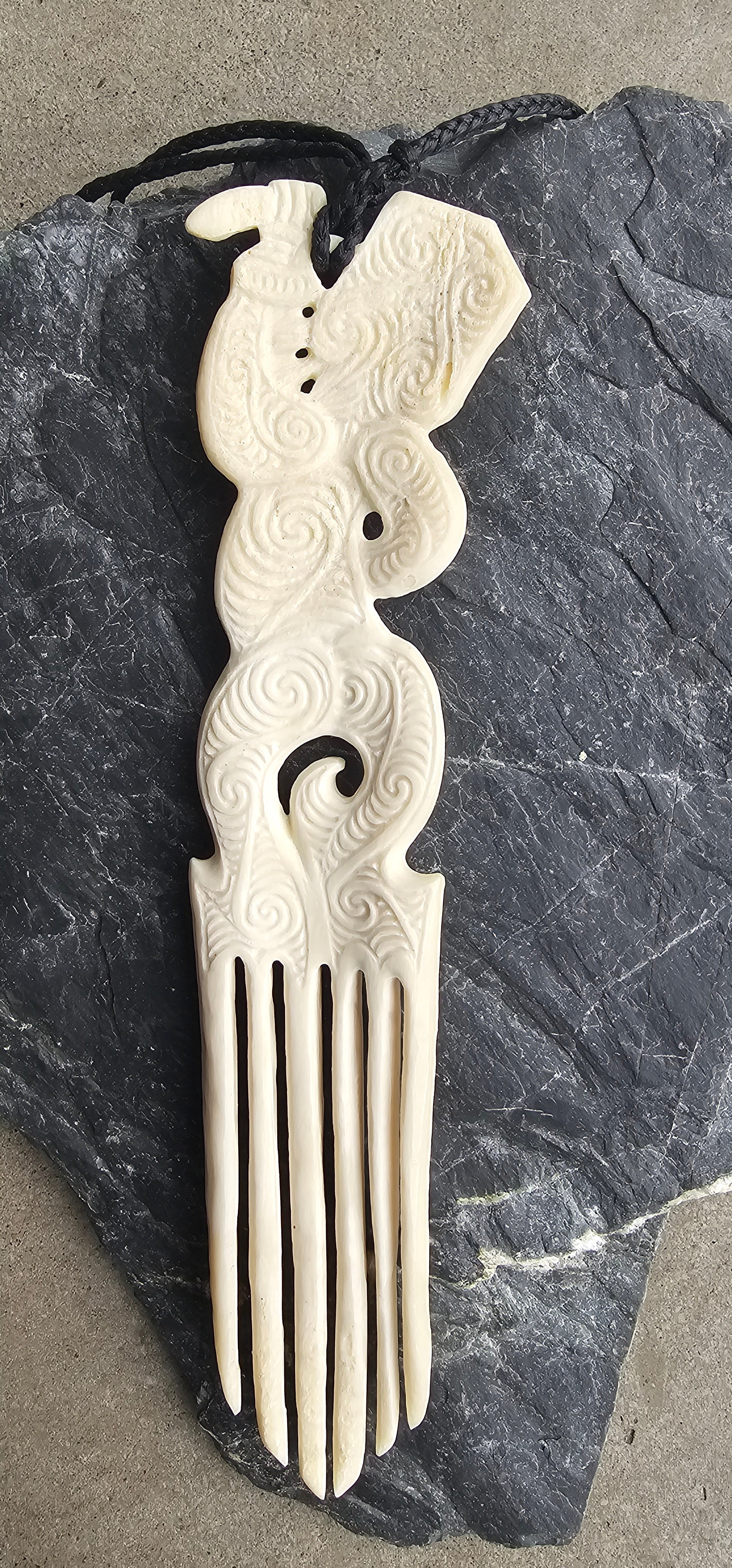 It measures 25cm x 4.9 cm, is double-sided, and comes with a black adjustable waxed cord to wear as a necklace but can be removed to wear in the hair as a heru (comb).