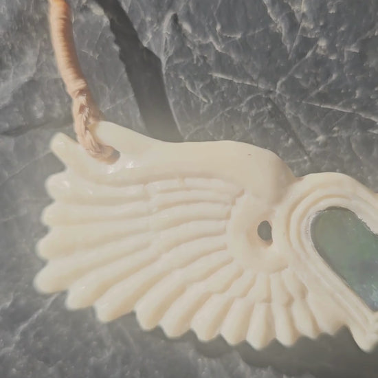 A beautiful contemporary peice representing love (paua heart) and freedom (the wings).